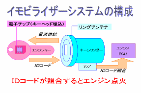 現在盗難防止に最も有効とされている装置はイモビライザーです。これは、エンジンキーに埋め込まれている送信機のIDコードと車体本体内に登録されているIDコードが一致しないとエンジンがかからない装置です。
