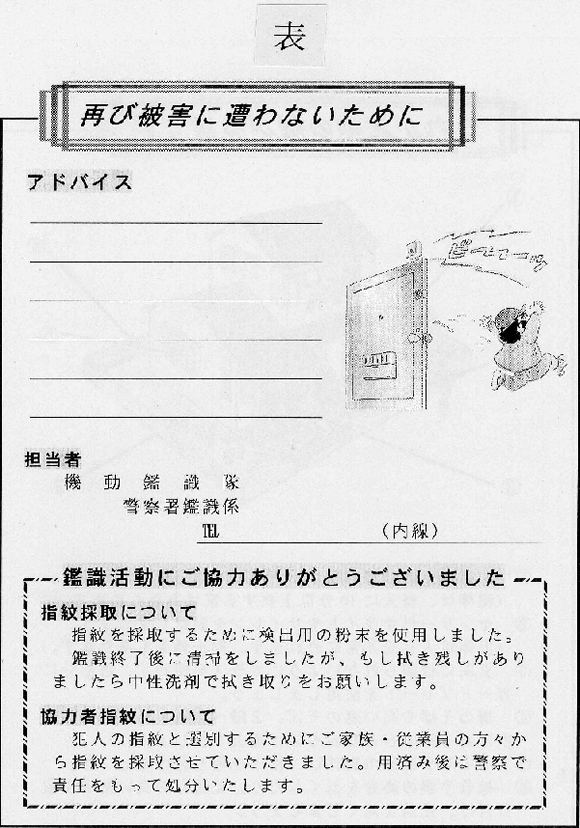 空き巣狙いなどの侵入窃盗の被害者に現場の鑑識係(プロの目)が防犯上の問題点と改善策をこのカードに書いて、再び同じ被害に遭うことがないように家族全体で防犯対策に取り組んでいただきたいと思い作成しました。