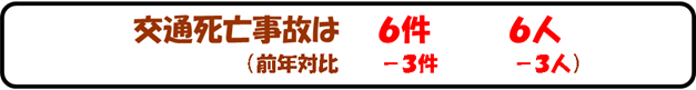 | 死者数 | 6 | 9 | ▲ 3 | ▲ 33.3 | |||||||||||||||||||||||||||||||||||